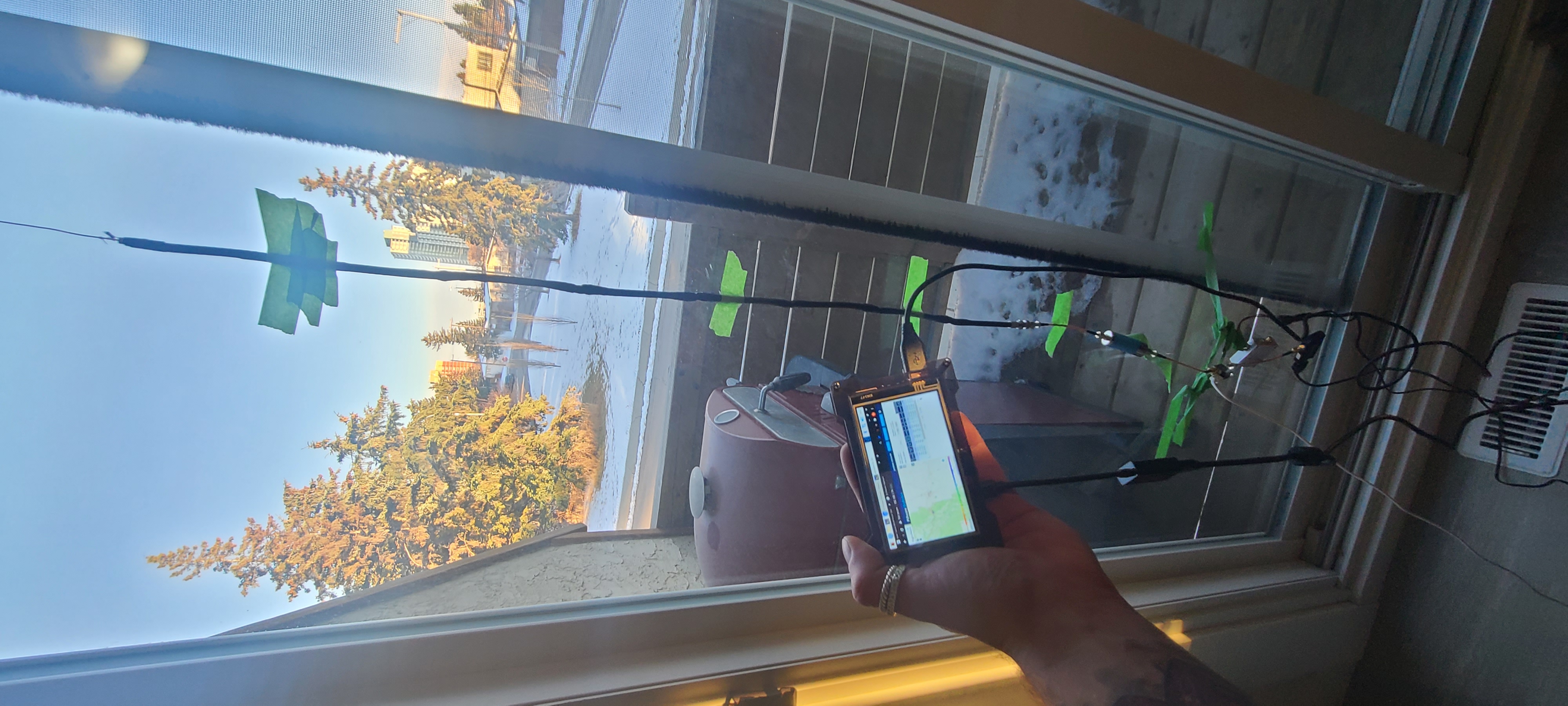 The 8-section coco antenna was confirmed to work better when tested in CubicSDR and thus, the antenna was taped to a window and a Raspberry Pi 4 with an LCD screen