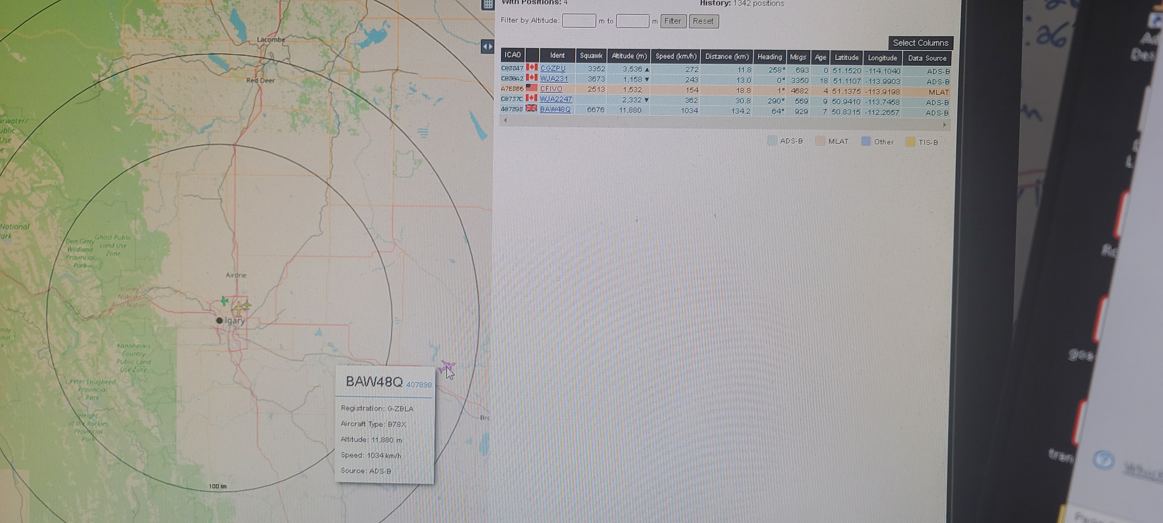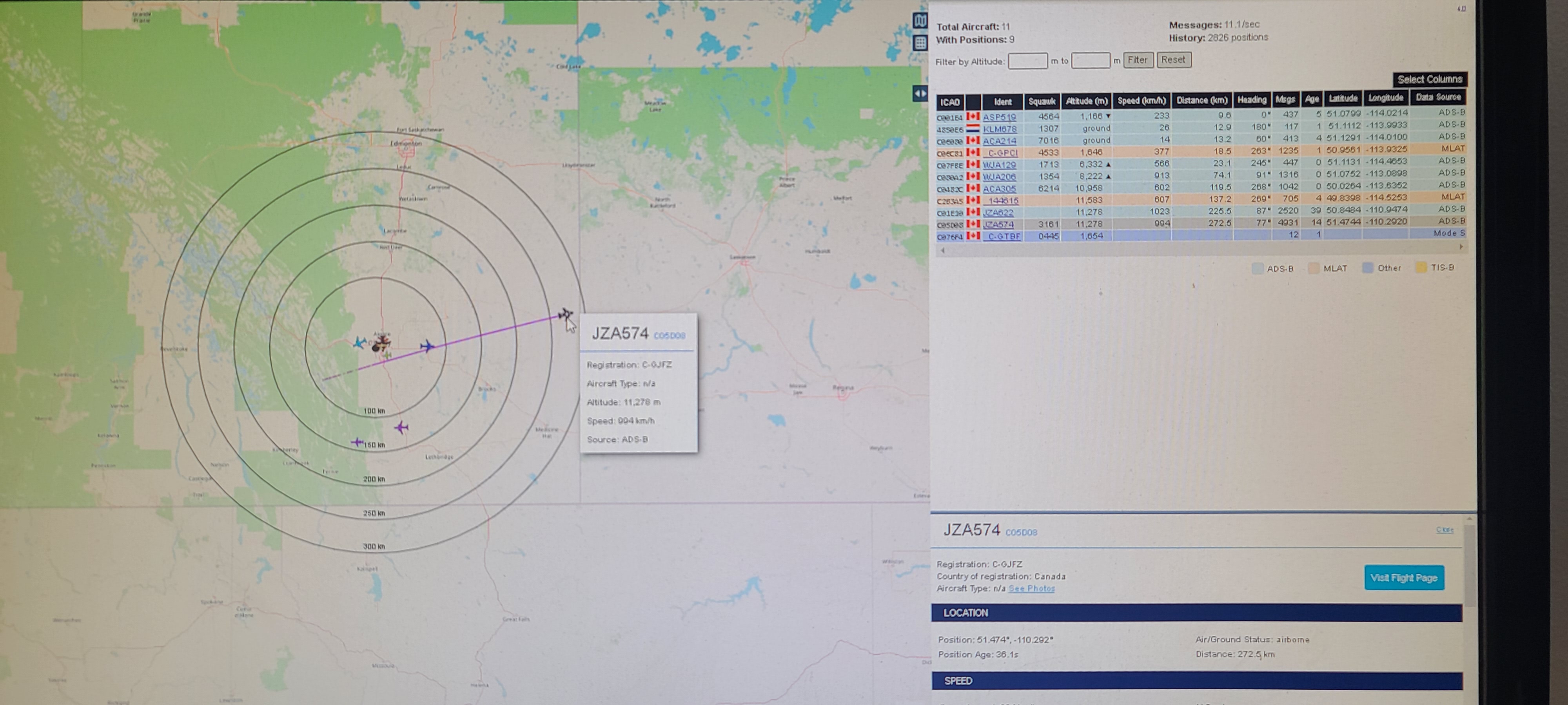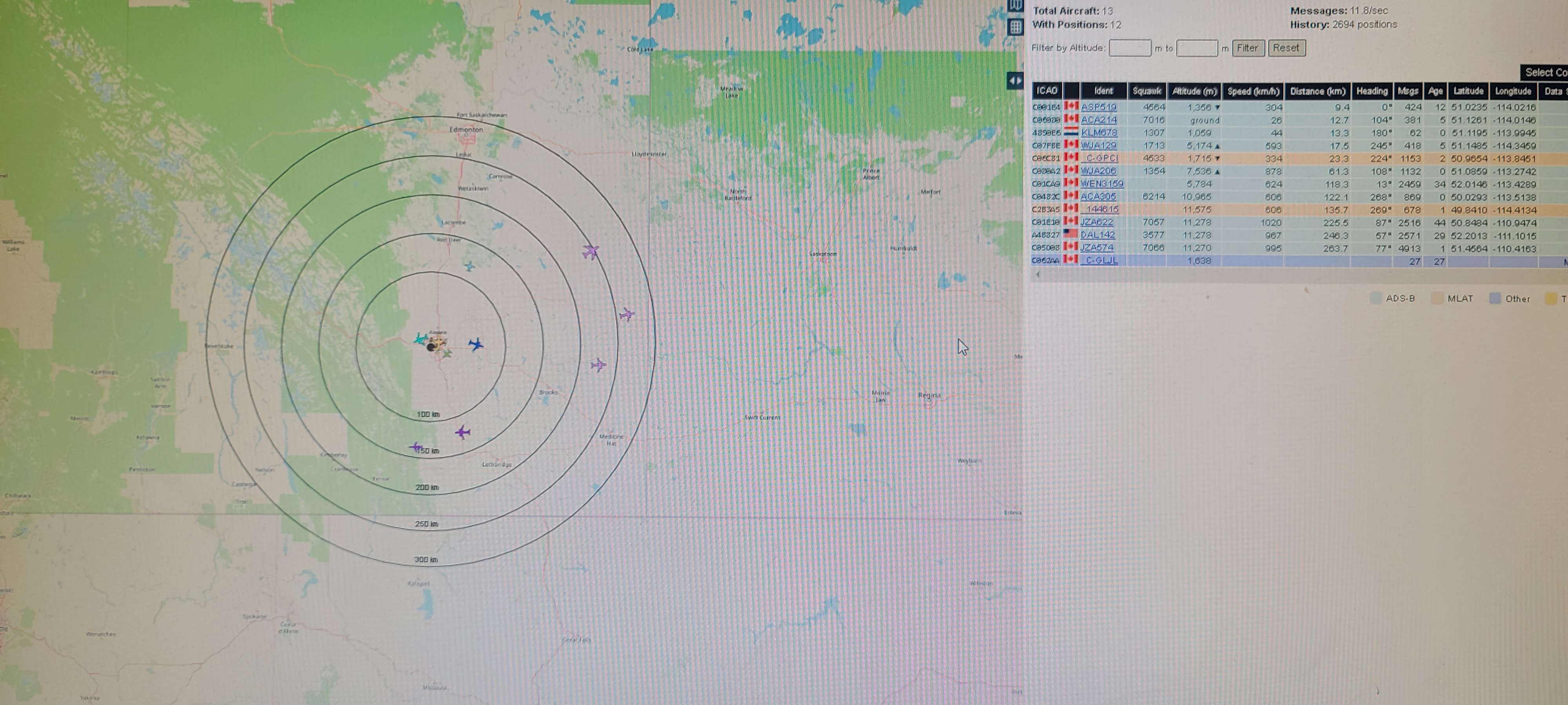 Once the setup was placed outside, the ADSB radar system began picking up many more airplanes. This is shown in Figure 12, where distances of 263.7, 246.3, and 225.5 kms were seen at the same time.